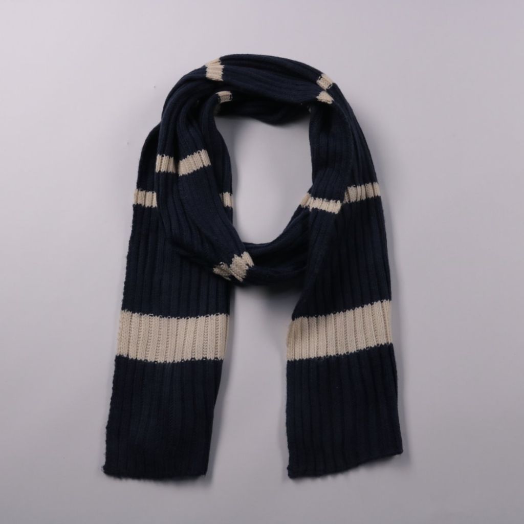 Вязаный шарф в рубчик с контрастными белыми полосами, без видимых следов износа. Подойдёт для повседневной носки в холодную погоду и легко сочетается с тёмной верхней одеждой. Плотная вязка хорошо удерживает тепло и комфортно драпируется.