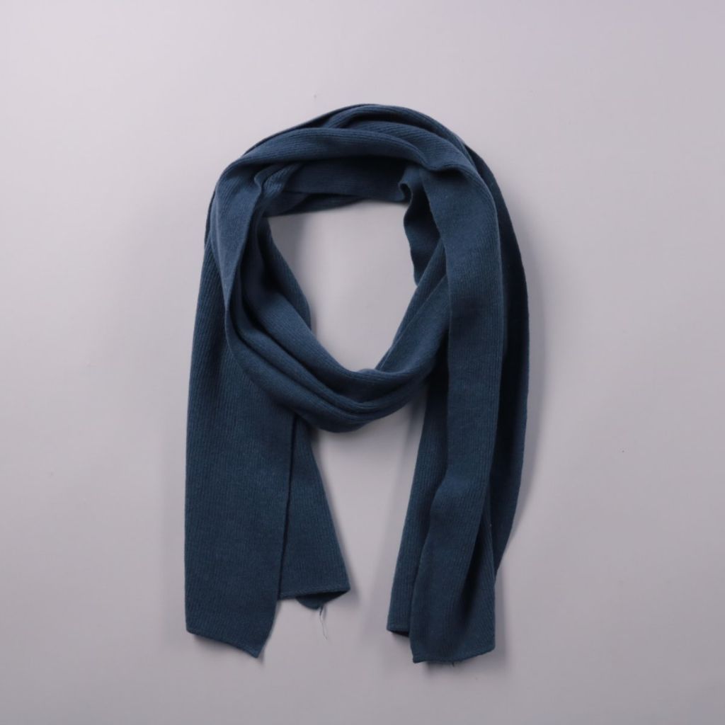 Трикотажный шарф синего цвета без видимых логотипов. Подойдёт для повседневных образов в прохладную погоду, чтобы защитить шею от ветра. Мягкий материал удобно драпируется и легко завязывается.