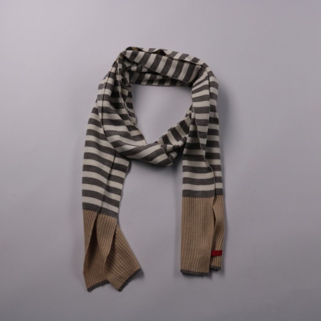 Вязаный шарф Esprit в полоску серо-белого и бежевого цветов. Подойдёт для повседневных образов и прогулок в прохладную погоду, хорошо сочетается с пальто или курткой. Мягкий трикотаж удобно драпируется и даёт дополнительное тепло в зоне шеи.