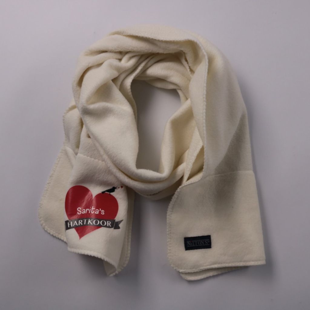 Плед Nilton's из мягкого флиса молочного цвета, с обработанным краем и принтом «Sarita’s HARTKOOR». Подойдёт для дивана, кресла или как дополнительный слой на кровать. Лёгкий и быстро сохнет после стирки.
